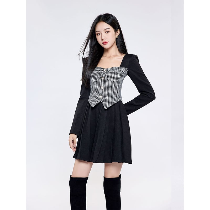 【Airi Styleシリーズ】ワンピース OL/通勤 切り替え Aライン シボ裾 長袖 ブラック S M L