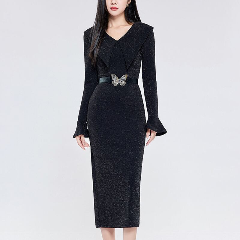 【Airi Styleシリーズ】ワンピース セクシー バタフライ ベルト付き Vネック 長袖 スピーカースリーブ ロング丈 ブラック S M L