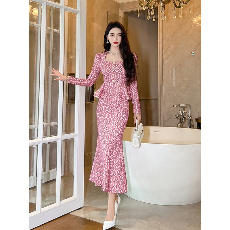 【夕暮薔薇シリーズ】セットアップ パーティー スクエアネック 長袖 フィッシュテール トップス+スカート ピンク S M L XL