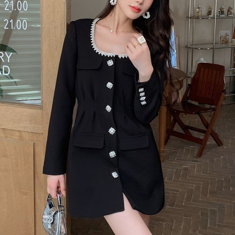 【Airi Styleシリーズ】ワンピース ラウンドネック 長袖 OL/通勤 ラインストーン ブラック S M L XL