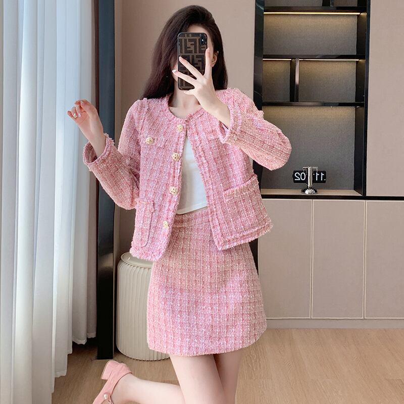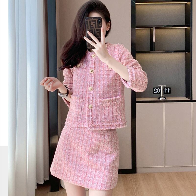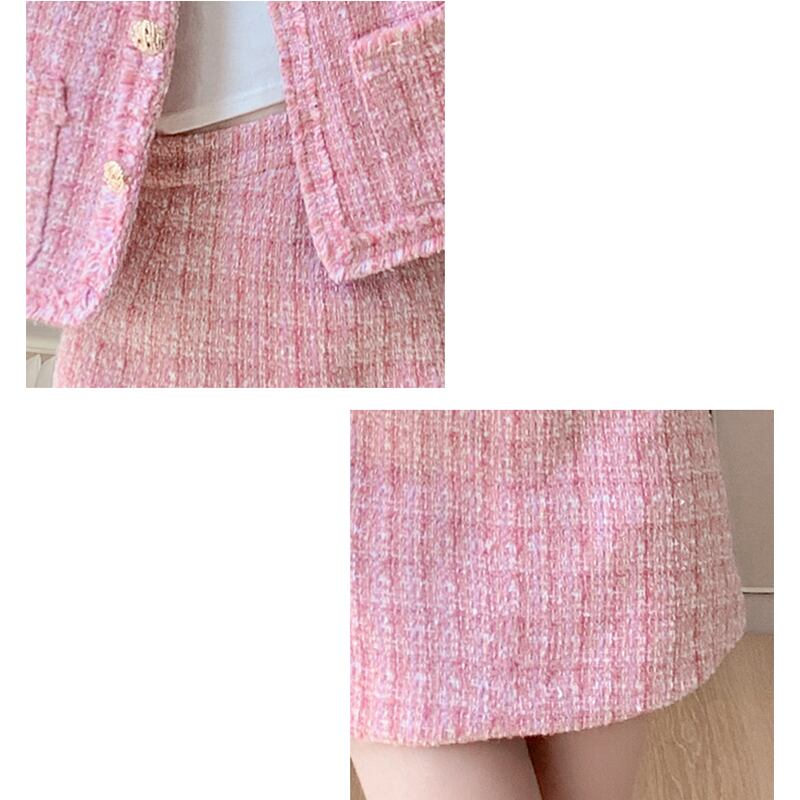 【森森家シリーズ】セットアップ 魅力的 キュート OL/通勤 ツイード 長袖 アウター+スカート ピンク S M L XL