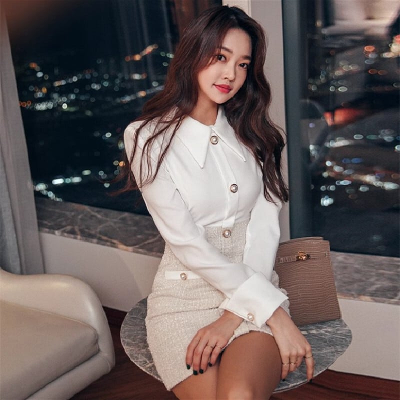 シャツワンピース シングルブレスト ツイード 上品らしく ホワイト S M L XL