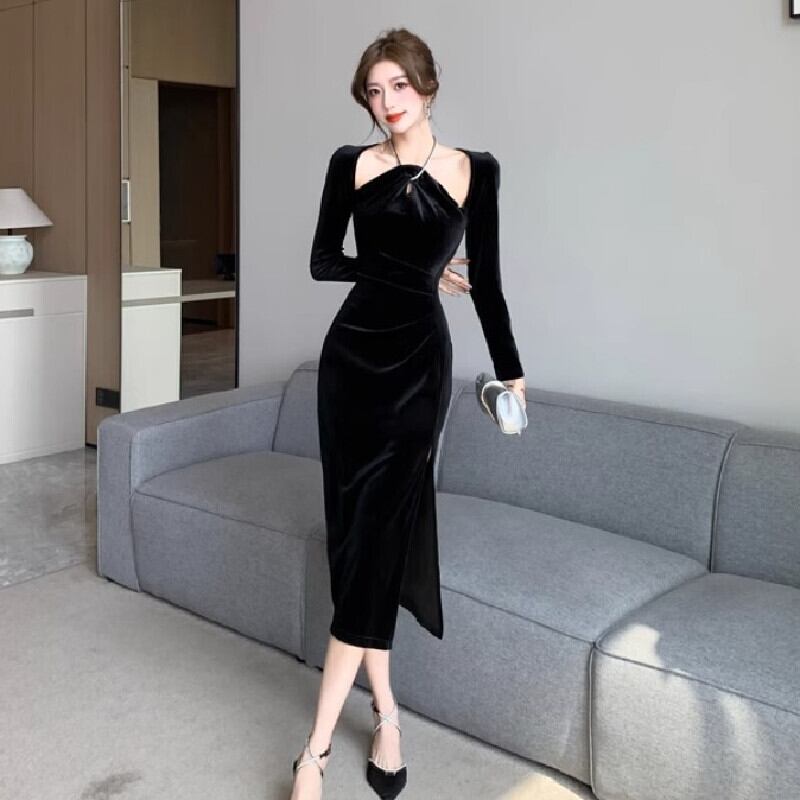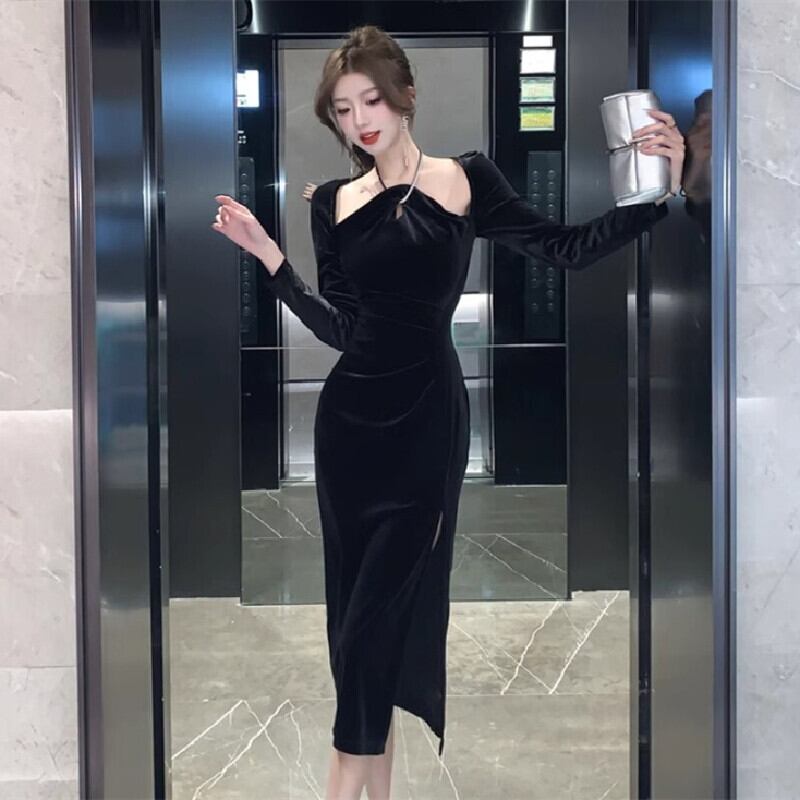 【CHERRYシリーズ】ワンピース ビロード パーティー 無地 スリット おしゃれ ブラック S M L