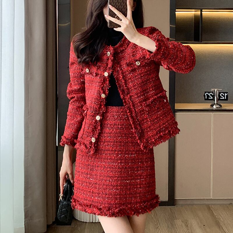【森森家シリーズ】セットアップ 流行兆し 高級感 OL/通勤 秋冬 ツイード アウター+スカート ダークレッド S M L XL