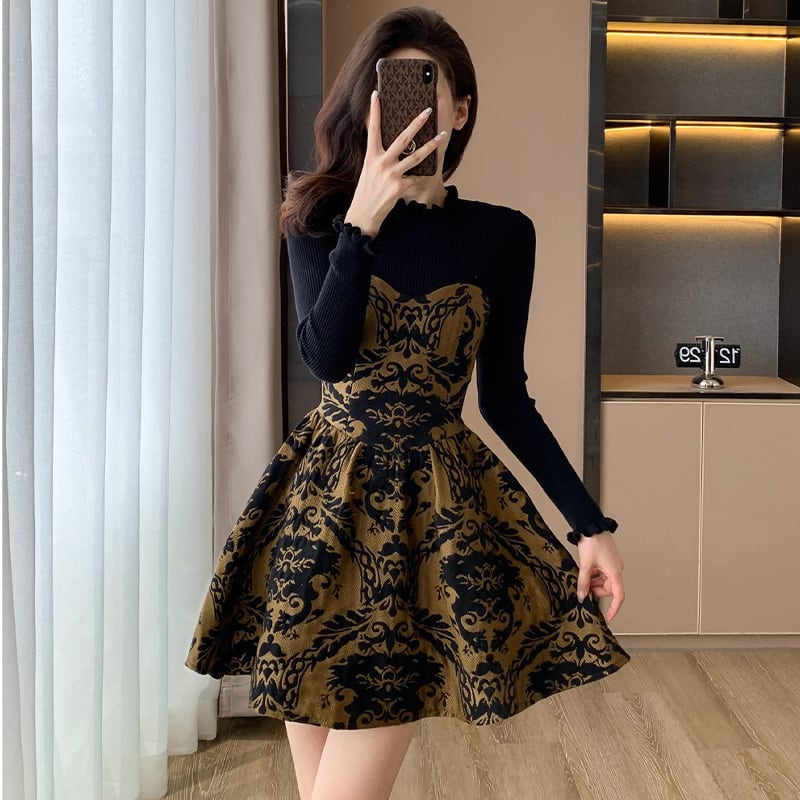 【森森家シリーズ】ワンピース レトロ OL/通勤 Aライン 花柄 長袖 切り替え S M L XL