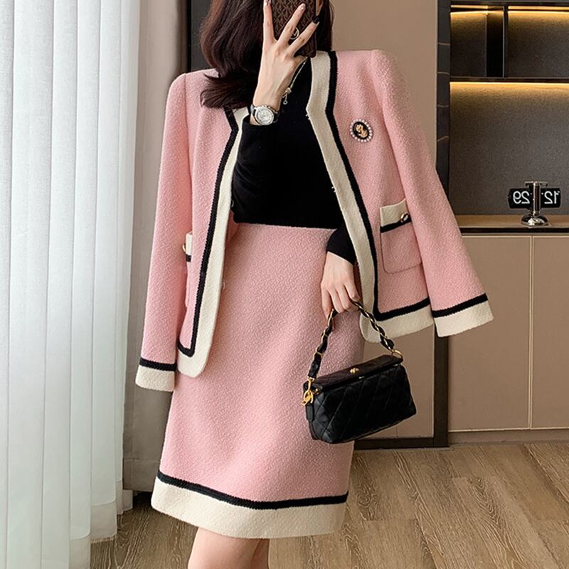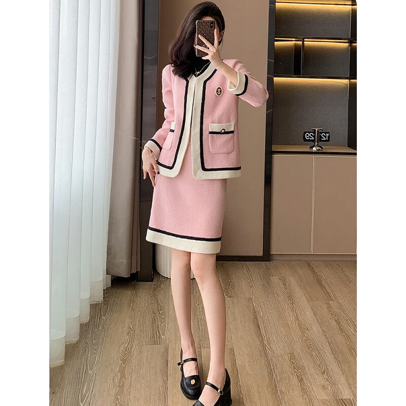 【森森家シリーズ】セットアップ 流行兆し 高級感 OL/通勤 秋冬 ツイード アウター+スカート ピンク S M L XL