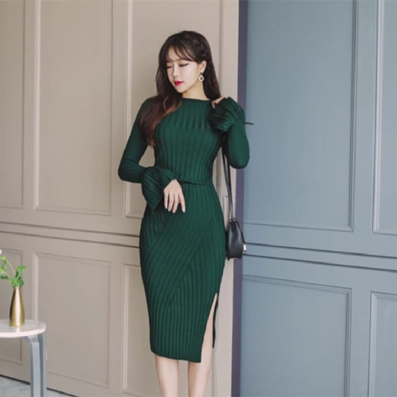 セットアップ トップス+スカート ニット 2色展開 スピーカースリーブ ダークグリーン ブラック S M L