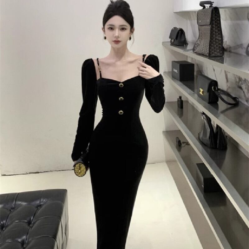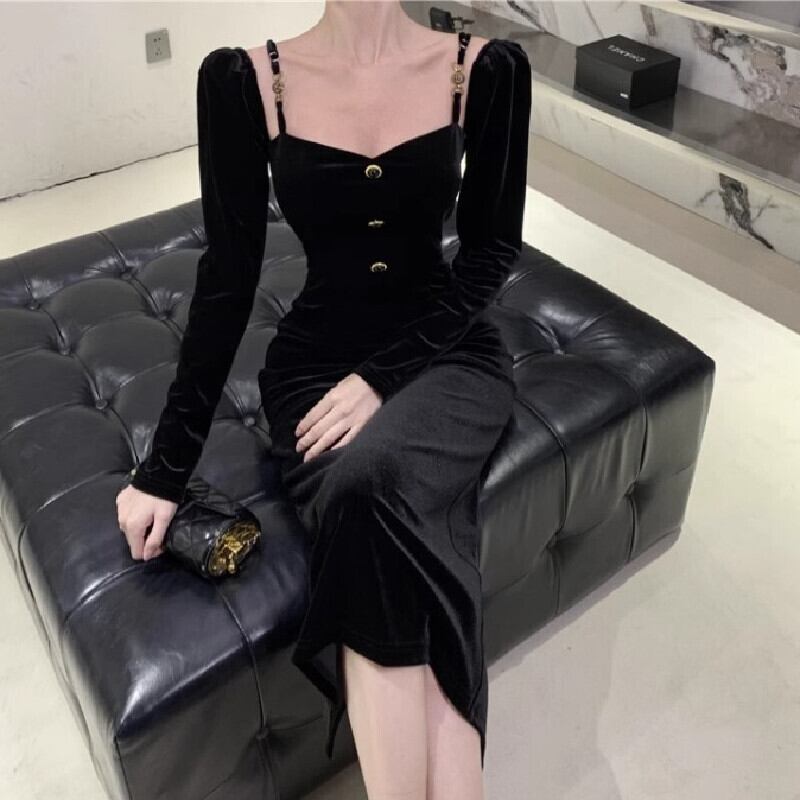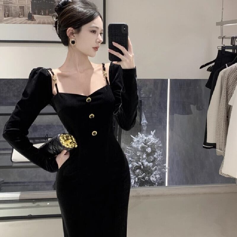 ワンピース スクエアネック ビロード 黒 長袖 バックスリット ブラック S M L