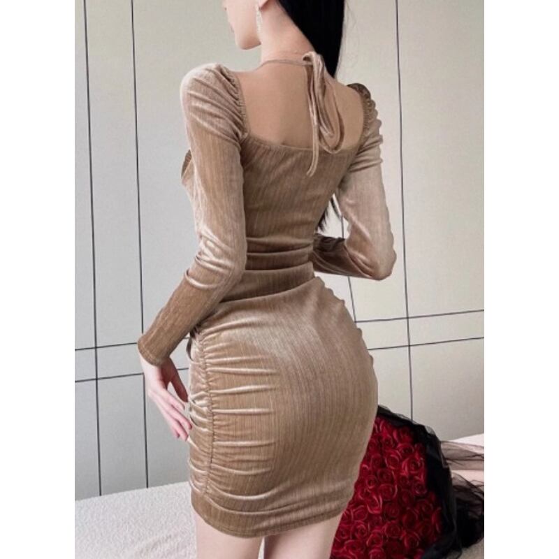 ワンピース スクエアネック 無地 膝上 ビロード 魅せる ダークベージュ S M L