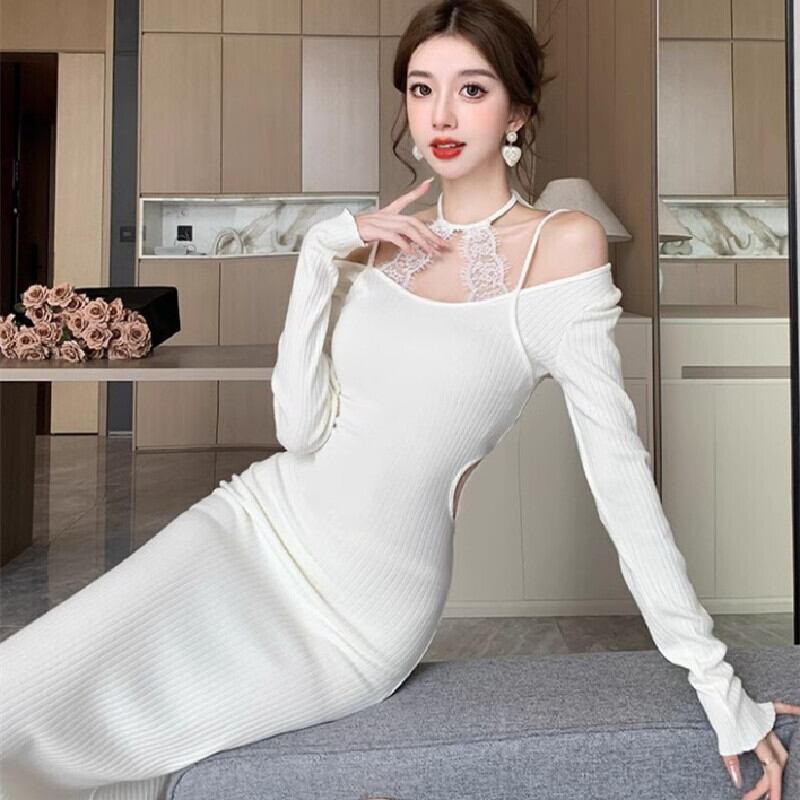【CHERRYシリーズ】ワンピース ニット 2色展開 オフショルダー レース ベージュ ブラック S M L
