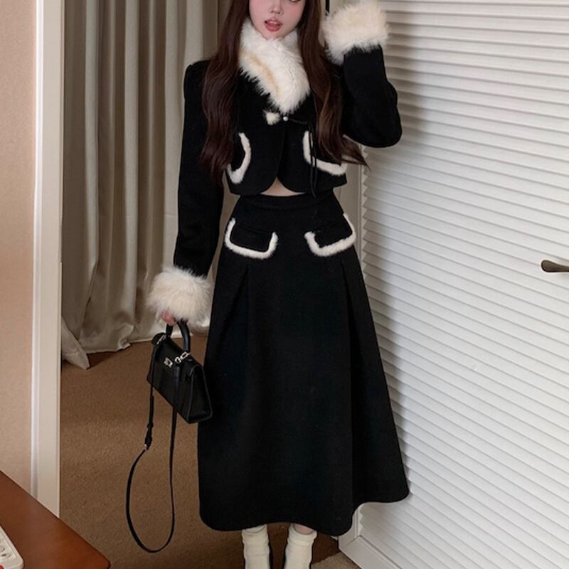 セットアップ スウィート OL/通勤 気質UP 長袖 切り替え アウター+スカート ブラック S M