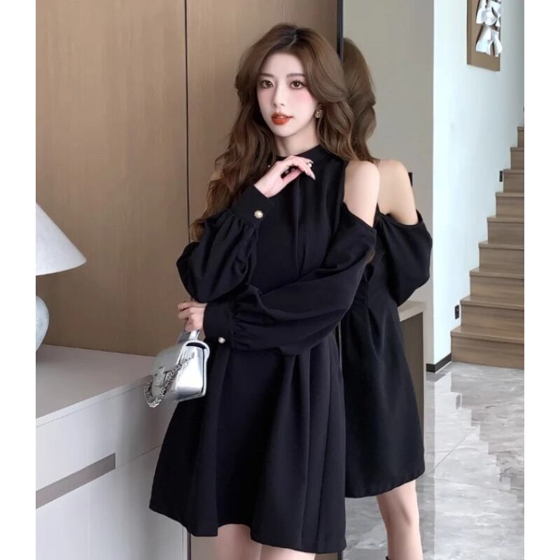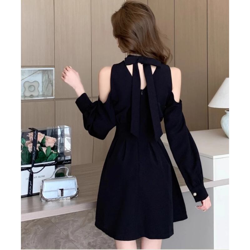 【CHERRYシリーズ】ワンピース バックリボン Aライン オフショルダー ブラック S M L XL
