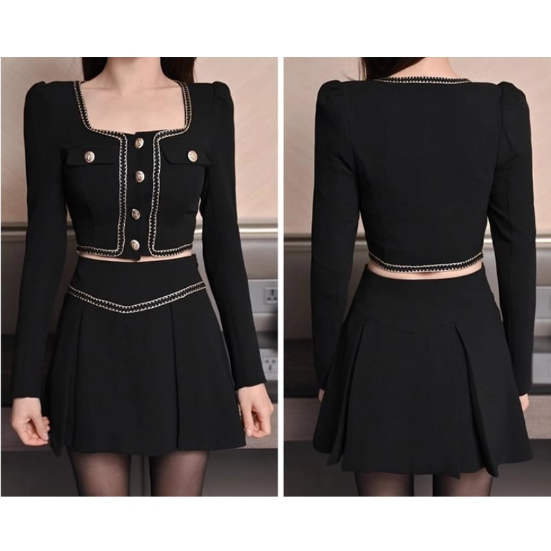 セットアップ トップス+スカート スクエアネック 長袖 ハイウエスト ブラック S M L XL
