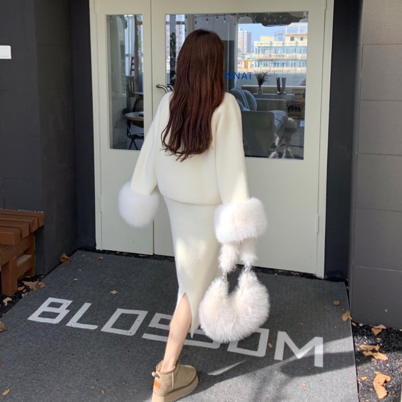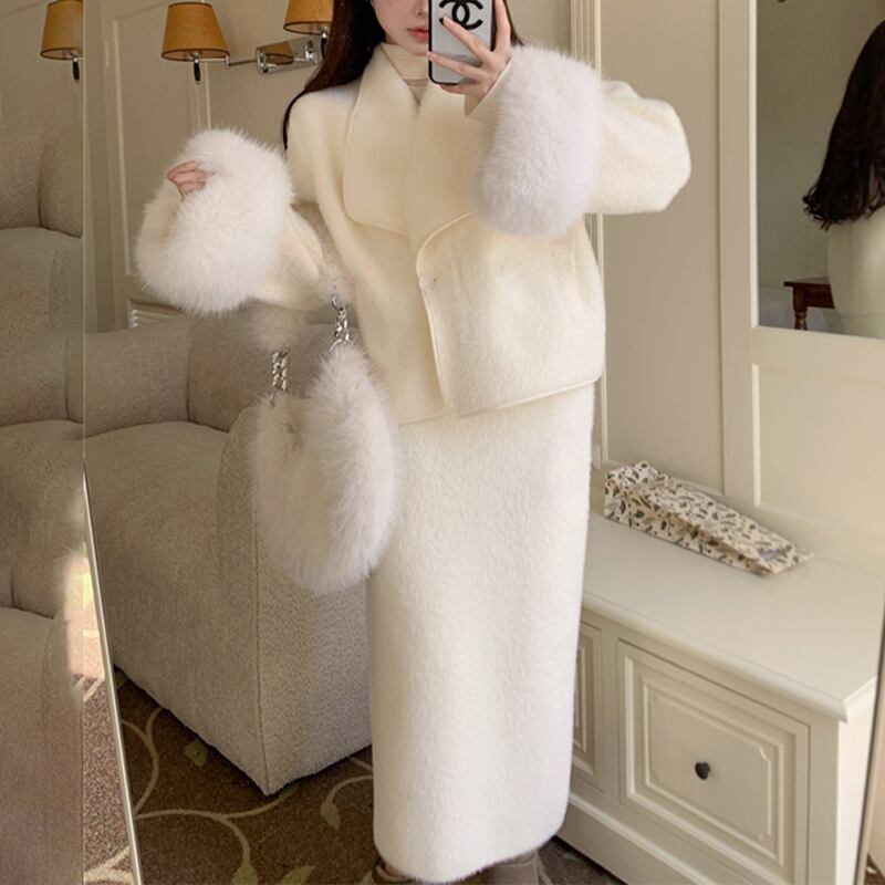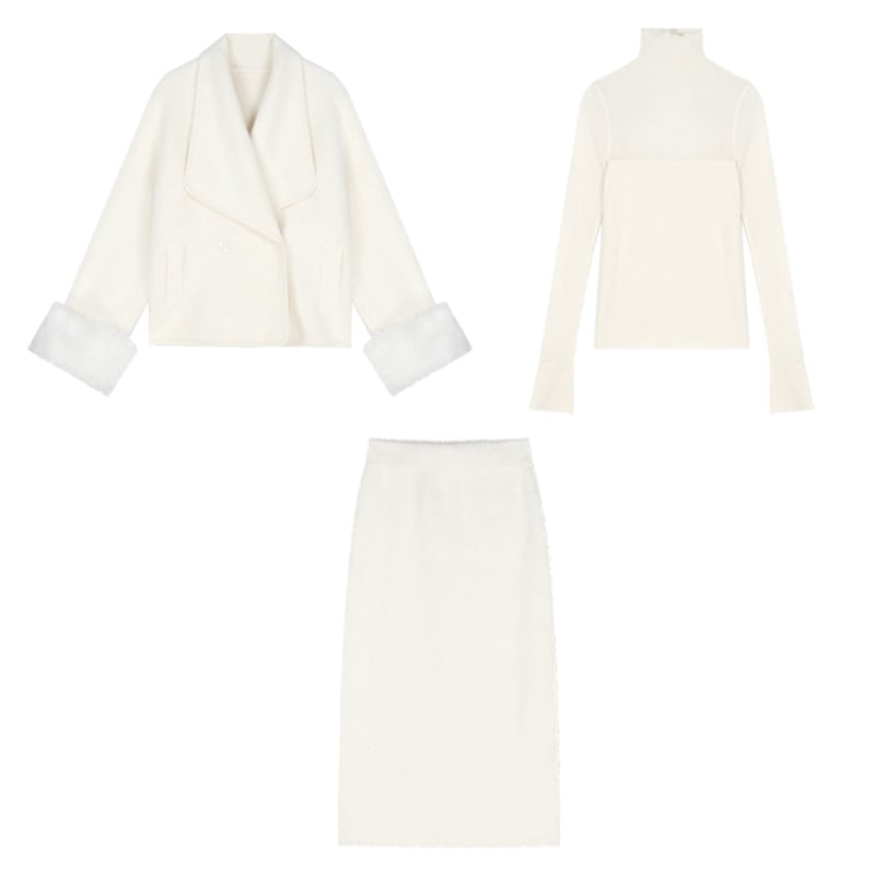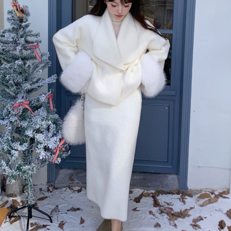 セットアップ 清新 OL/通勤 折り襟 長袖 ラシャ ファー袖口 アウター+スカート ベージュ