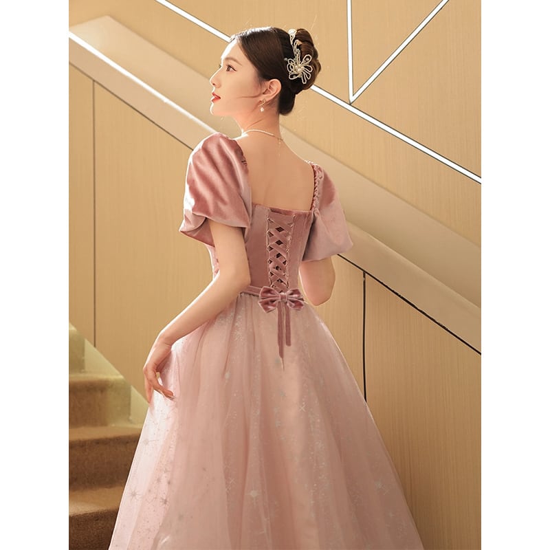 【優美シリーズ】パーティードレス ビロード パフスリーブ 宴会 プリンセス 結婚式 婚活 披露宴 ピンク