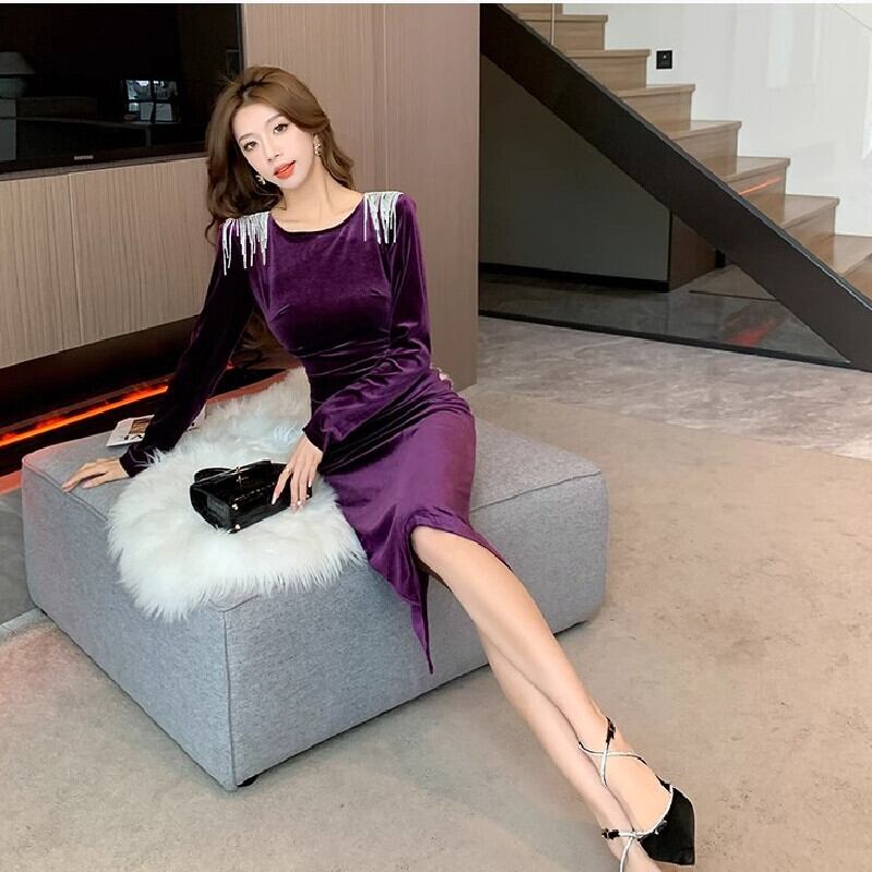 【CHERRYシリーズ】ワンピース 3色展開 無地 長袖 ビロード タッセル パープル レッド ブラック S M L XL