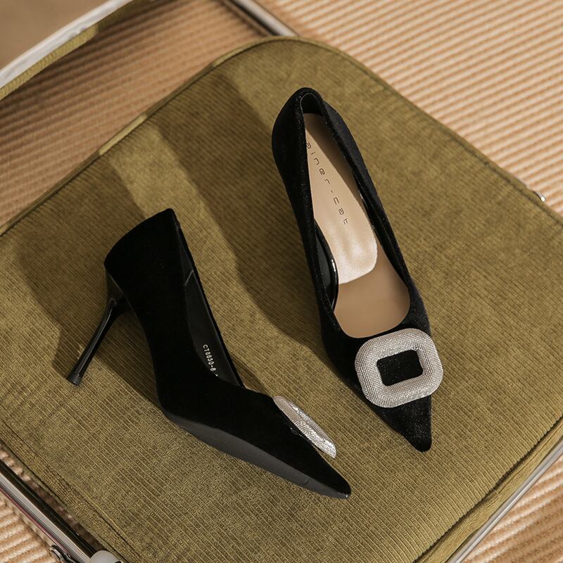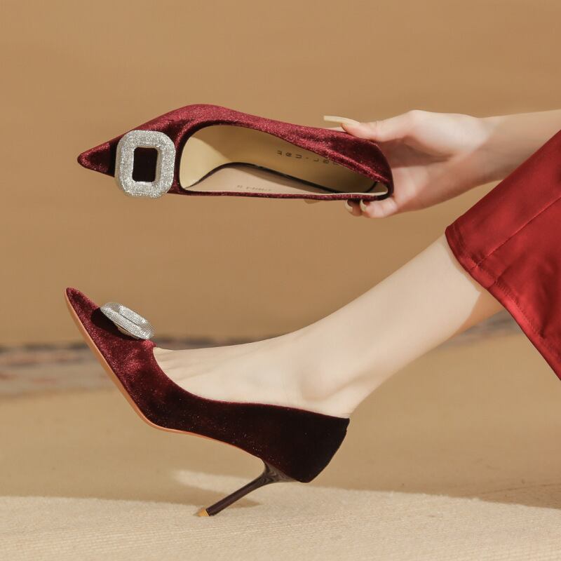 シューズ パンプス 2色展開 ラインストーン 通勤 ワインレッド ブラック 8CM