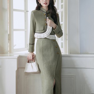 【XinZiシリーズ】セットアップ 切り替え レトロ 気質UP アウター+スカート グリーン S M L