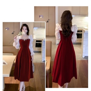 ワンピース スクエアネック パーティー ビロード ワインレッド S M L XL