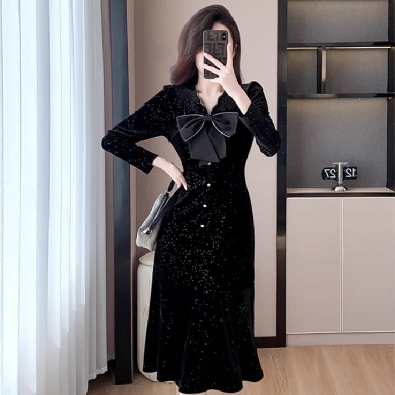 ワンピース Vネック 蝶結び 気質 黒 ビロード 着痩せ 大きいサイズ ブラック S M L XL 2XL