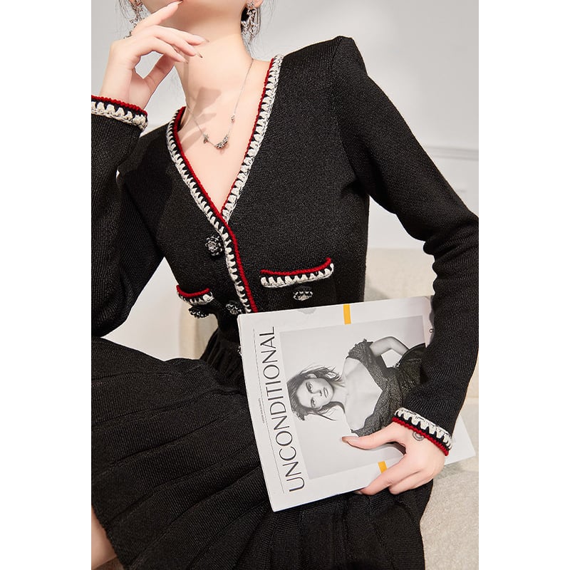 【Blue City シリーズ】ワンピース Vネック ニット シボ裾 長袖 Aライン ブラック S M L XL