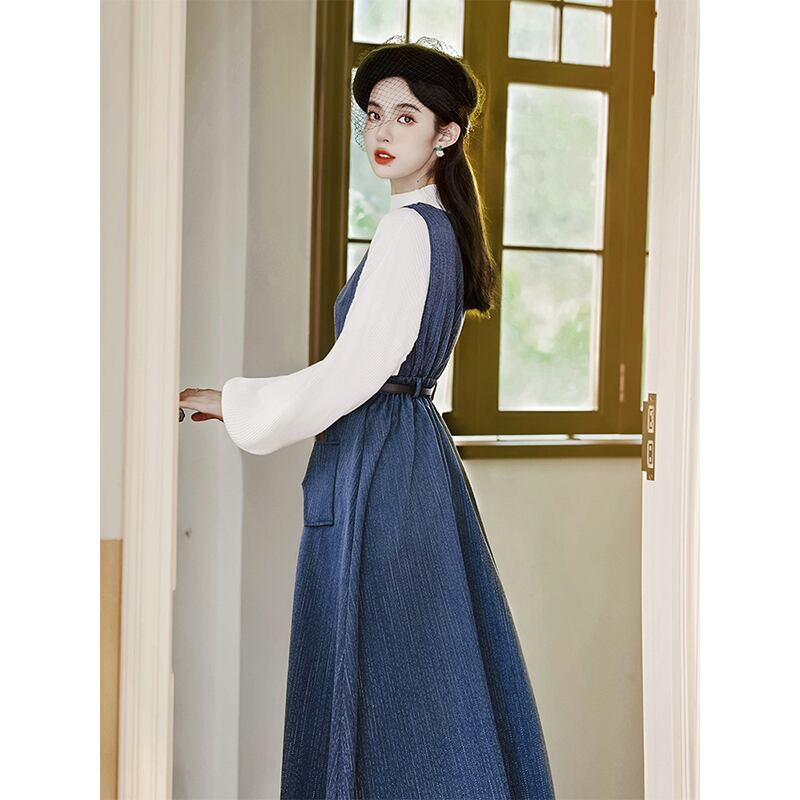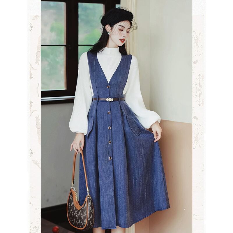 【XinZiシリーズ】セットアップ ベルト付き レトロ ニット ランタンスリーブ カットソー+スカート ブルー グリーン グレー S M L XL