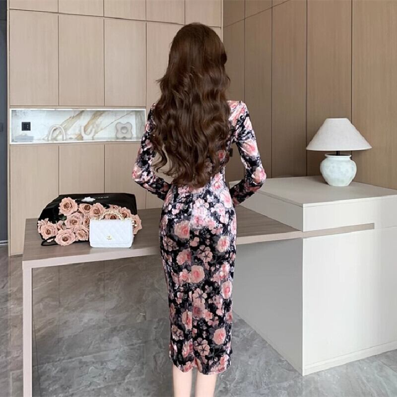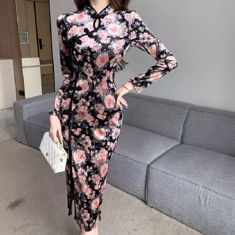 【CHERRYシリーズ】ワンピース チャイナ風 長袖 ビロード 花柄 魅せられる S M L