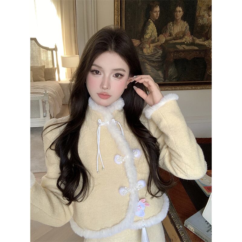 セットアップ チャイナ風 ファー袖口 厚手 アウター+スカート イエロー S M L