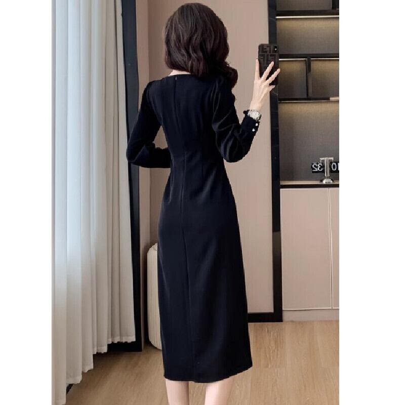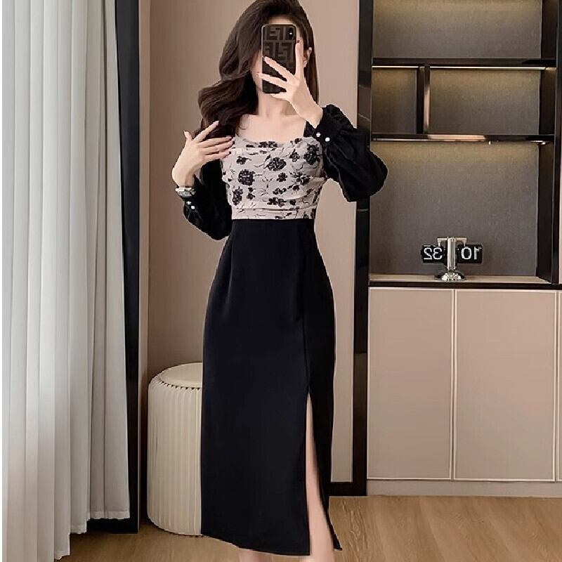 【森森家シリーズ】ワンピース スクエアネック 花柄 スリット エレガント ブラック S M L XL