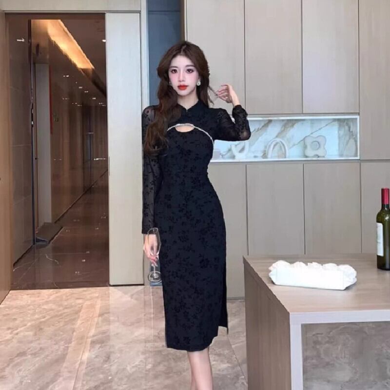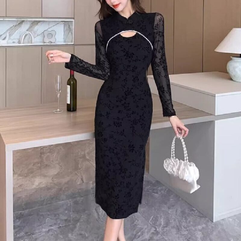 【CHERRYシリーズ】ワンピース プリントチャイナ風 魅せられる 着痩せ ブラック S M L