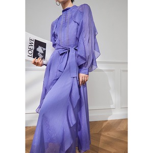 【Blue City シリーズ】ワンピース 高級感 華やか パプラム パーティー ランタンスリーブ ロング丈 長袖 パープル S M L XL