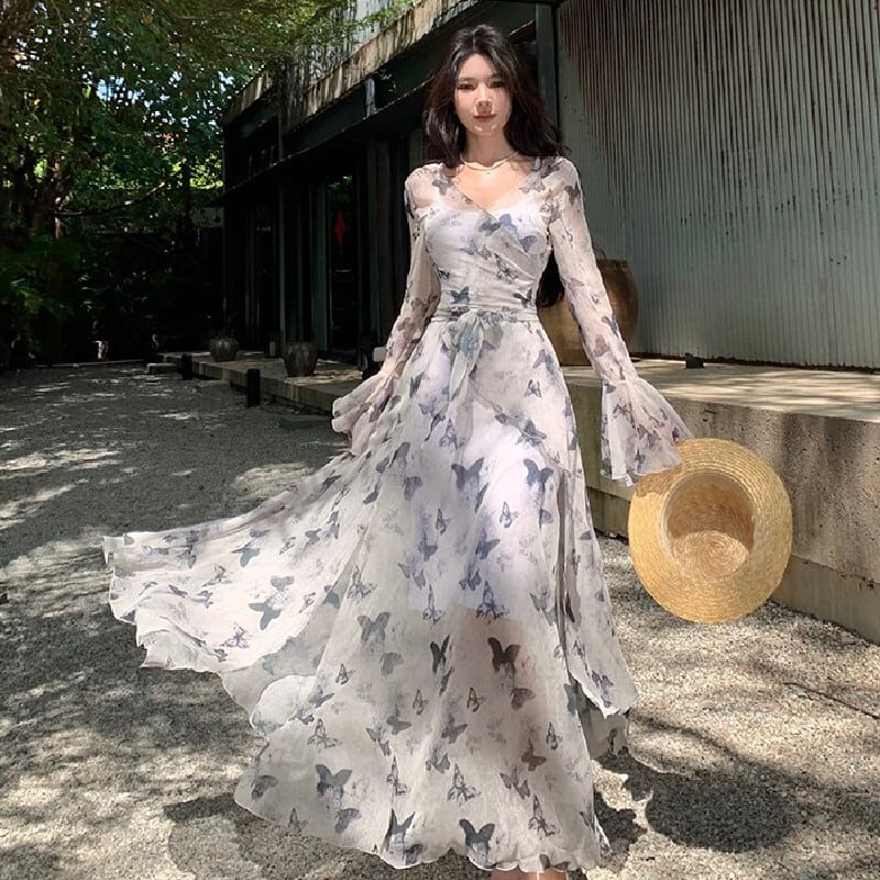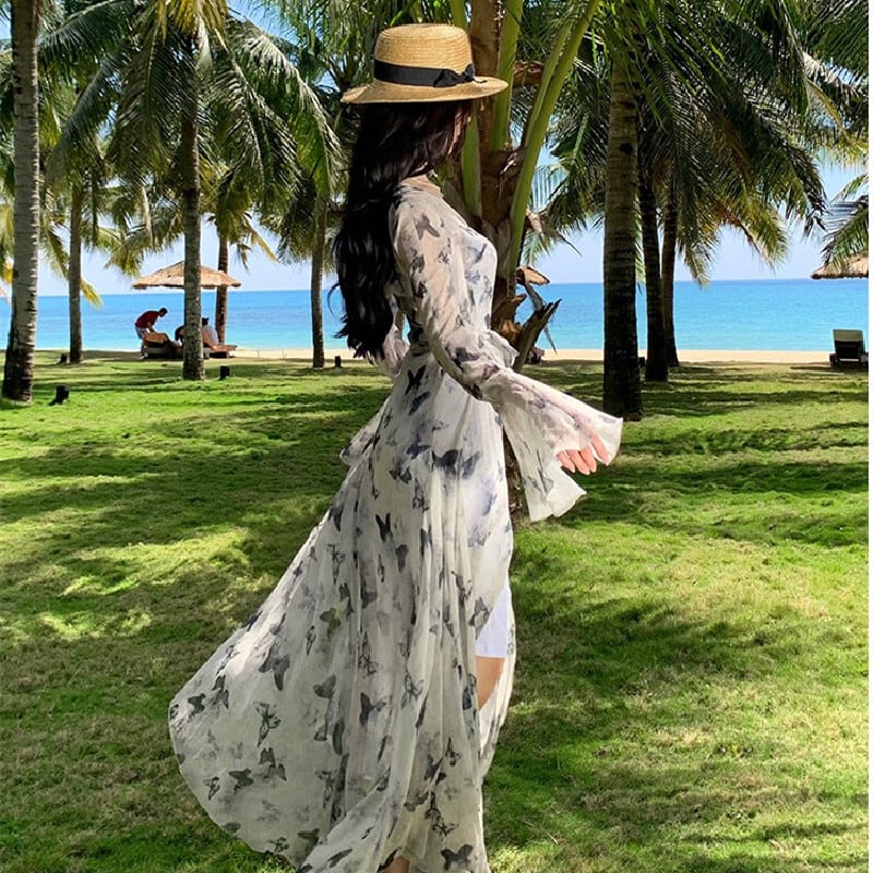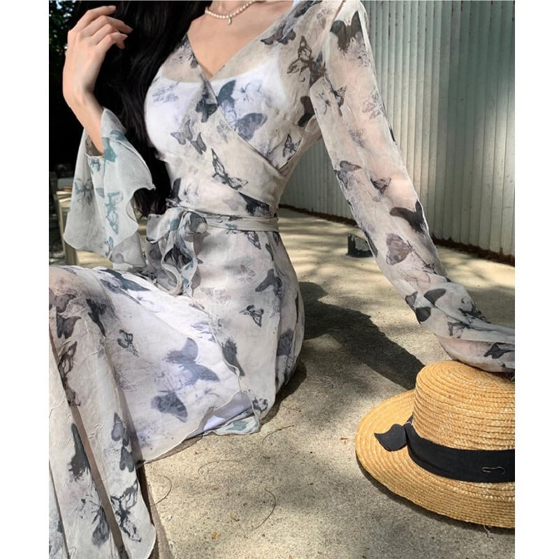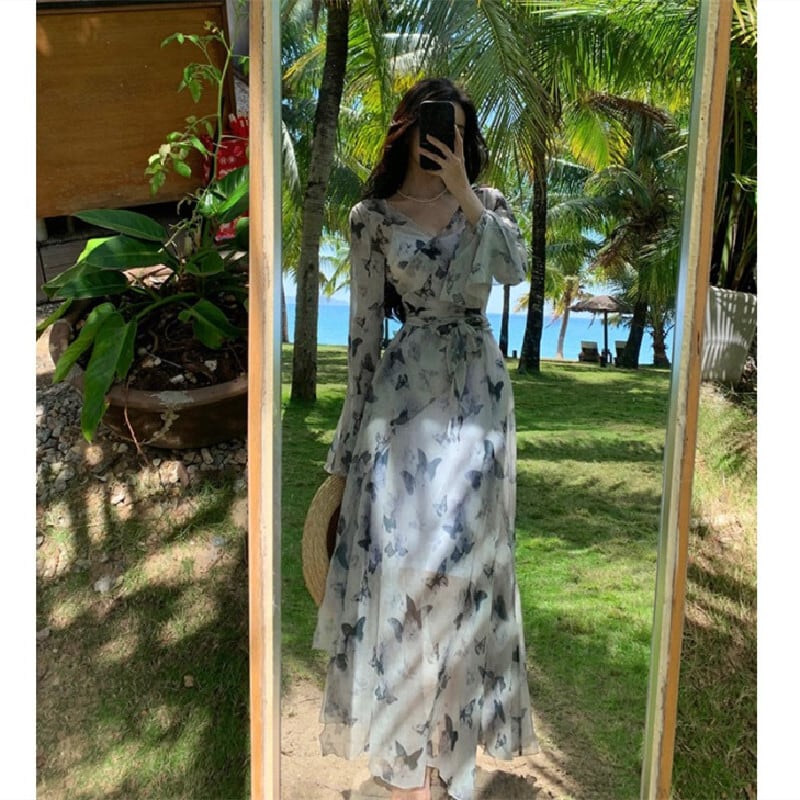 【SummerVacationシリーズ】ワンピース スピーカースリーブ 蝶模様 プリント 撮影着 S M L