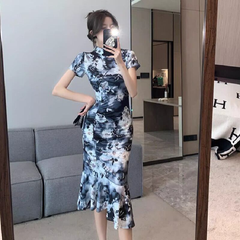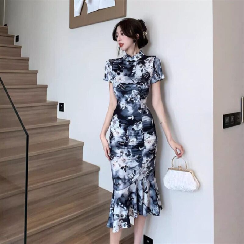 【CHERRYシリーズ】ワンピース チャイナ風 プリント 花模様 フィッシュテール S M L