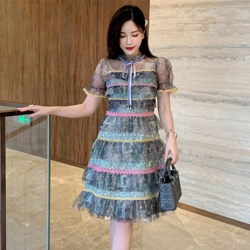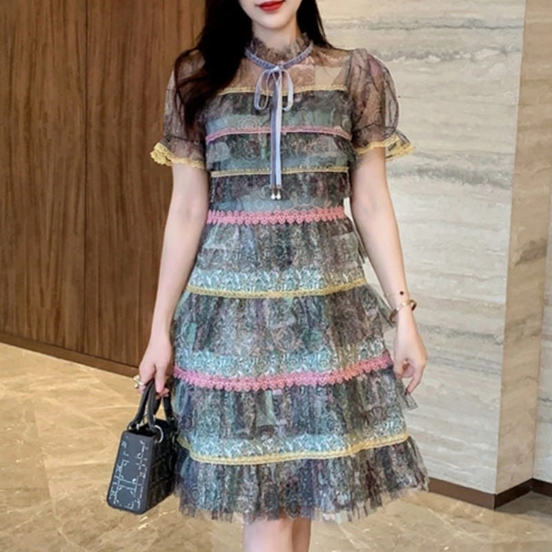【RIMIシリーズ】ワンピース レース パフスリーブ スウィート カラフル S M L XL 2XL