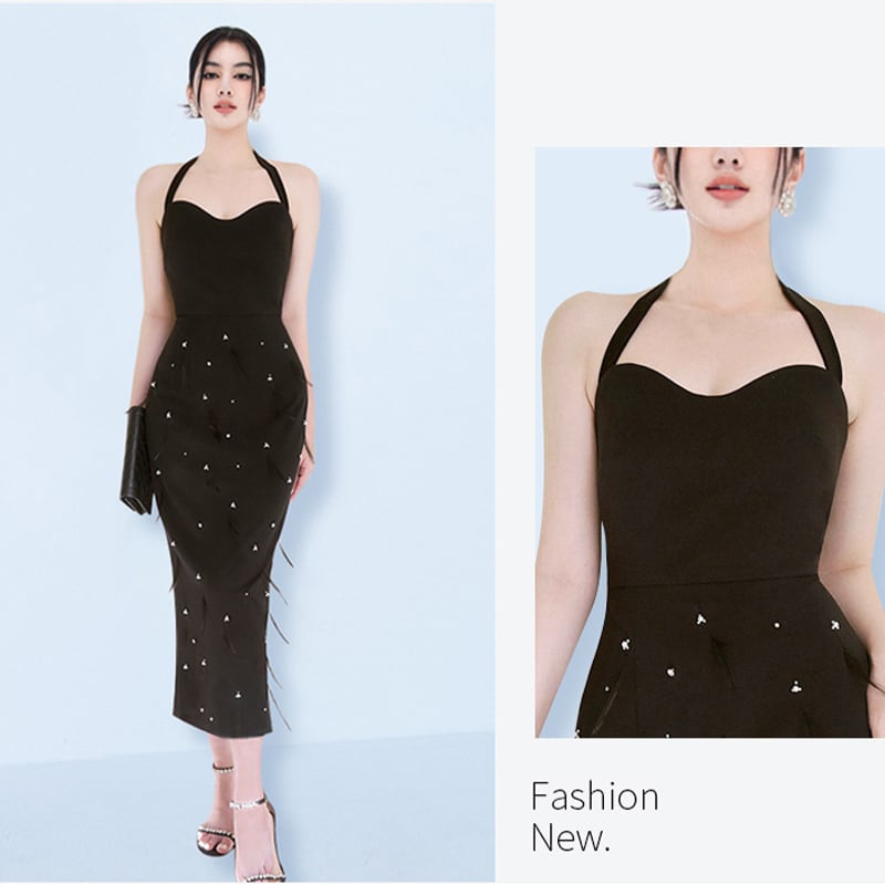 【Airi Styleシリーズ】ワンピース 優雅 ホルターネック ロング丈 ラインストーン パーティー ブラック S M L XL