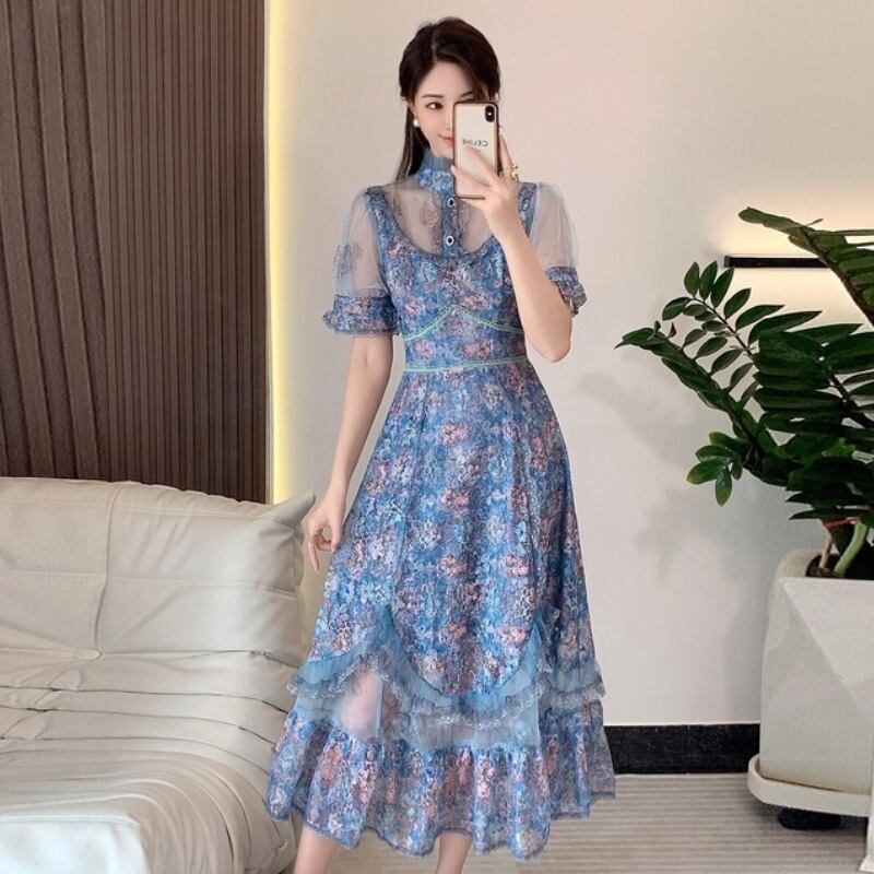 【RIMIシリーズ】ワンピース ハイウエスト 花模様 大きいサイズ ブルー S M L XL 2XL