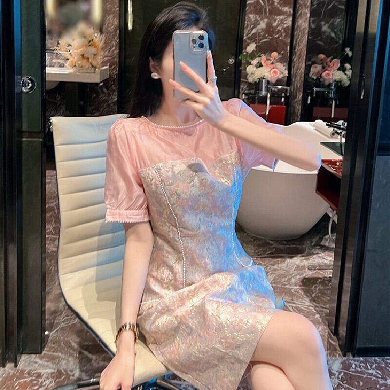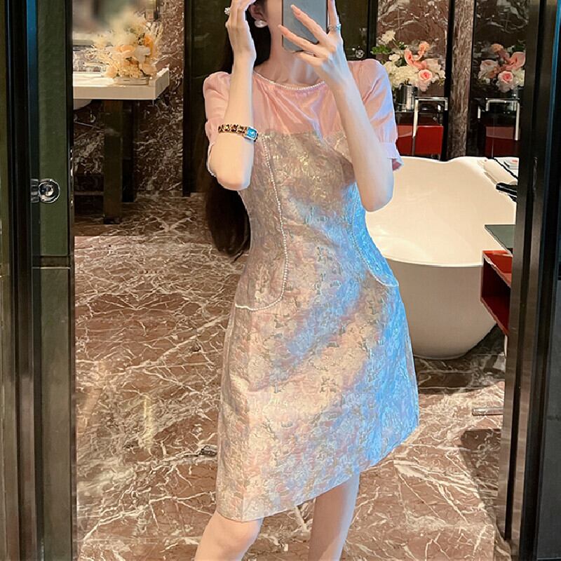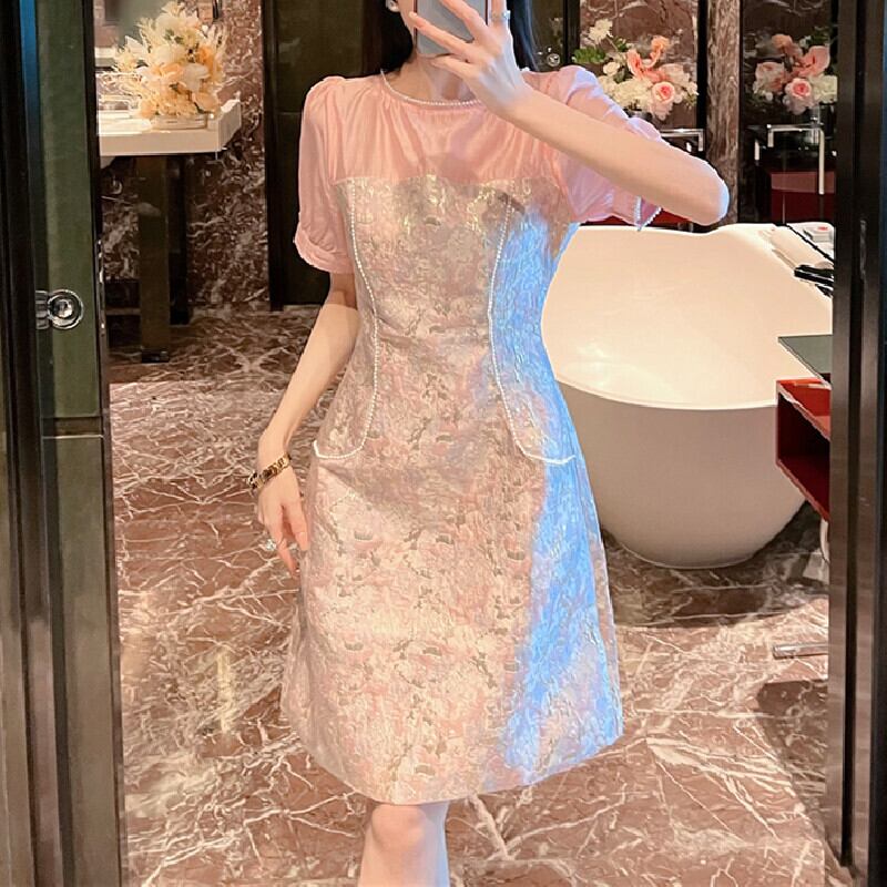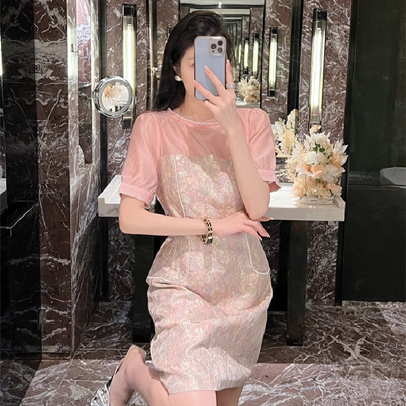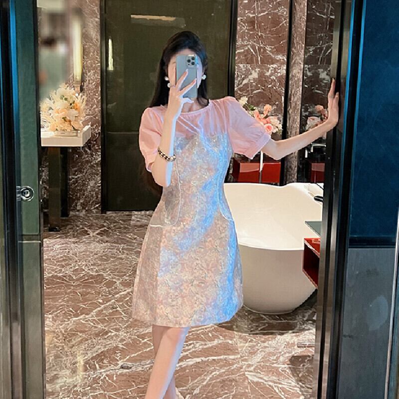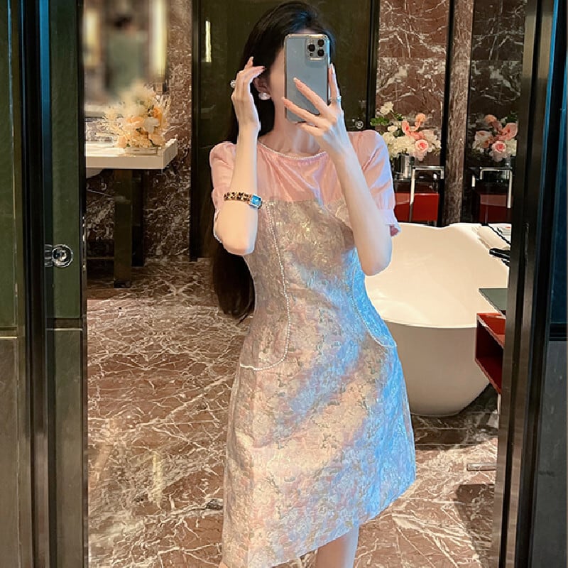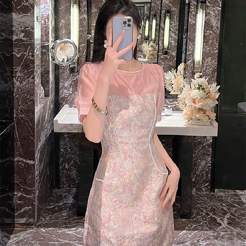【RIMIシリーズ】ワンピース スウィート パフスリーブ プリント ピンク S M L XL