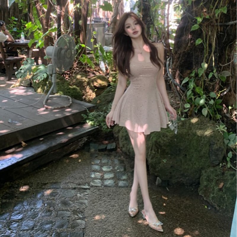 吊りワンピー デザイン感 セクシー Aライン シュート丈 ラインストーン ベージュ XS S M L