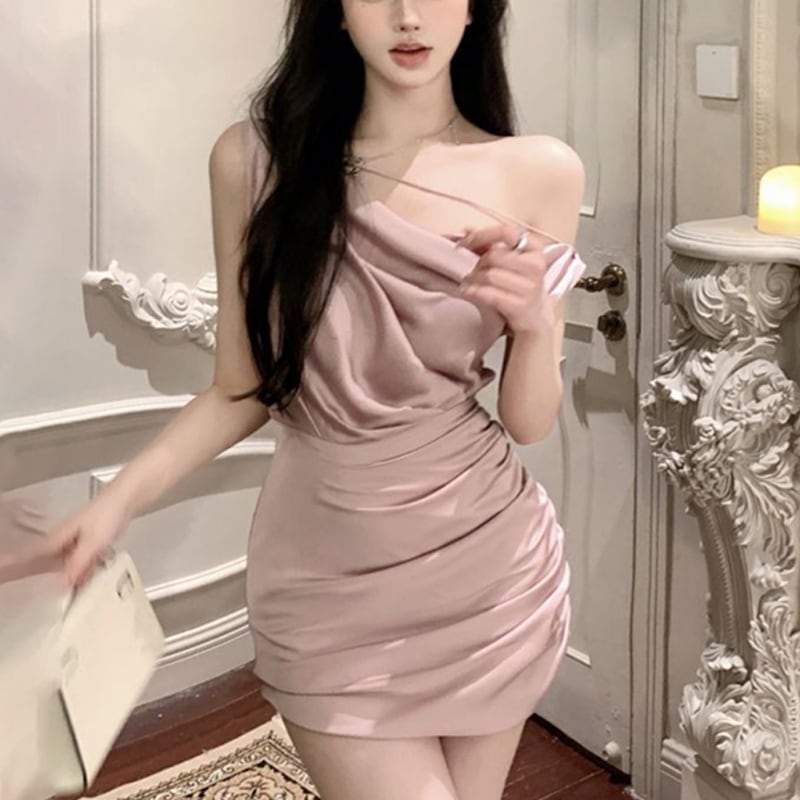ワンピース 高級感 パーティー ワンショルダー シルク ピンク シャンパン S M L