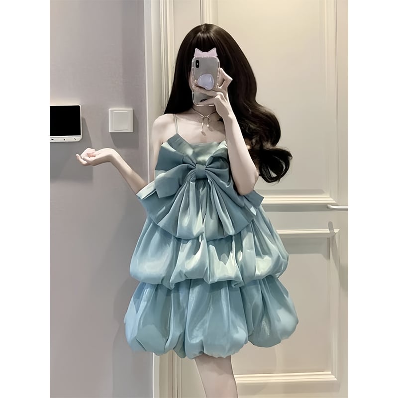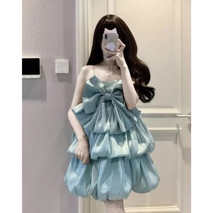 【Airi Styleシリーズ】吊りワンピース Aライン セクシー かわいい 蝶結び ティアード ブルー S M L XL