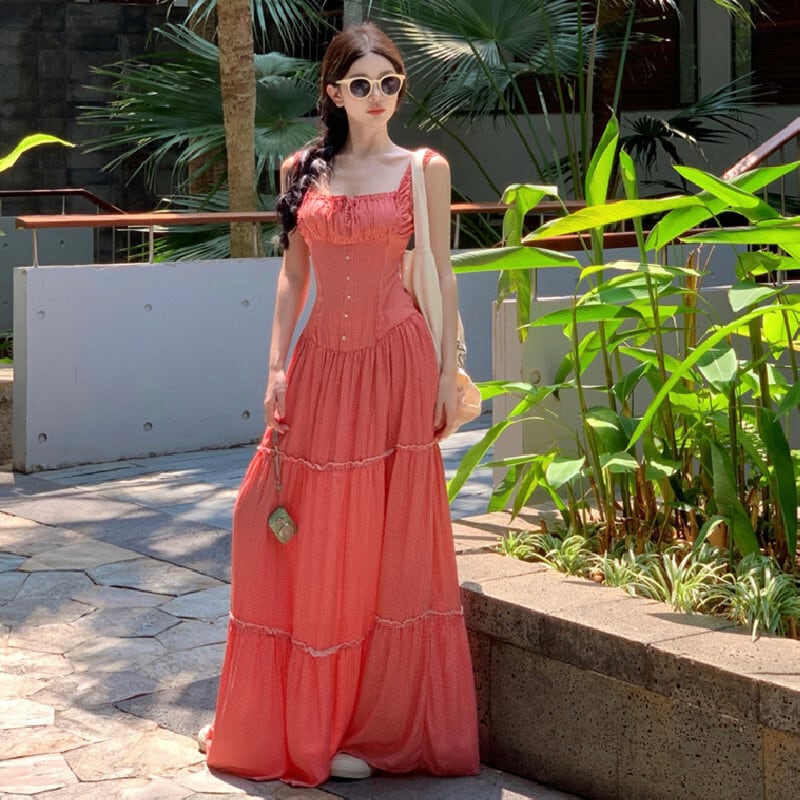 【SummerVacationシリーズ】ワンピース チェック柄 ロング丈 ハイウエスト レトロ 視線集中 S M L XL