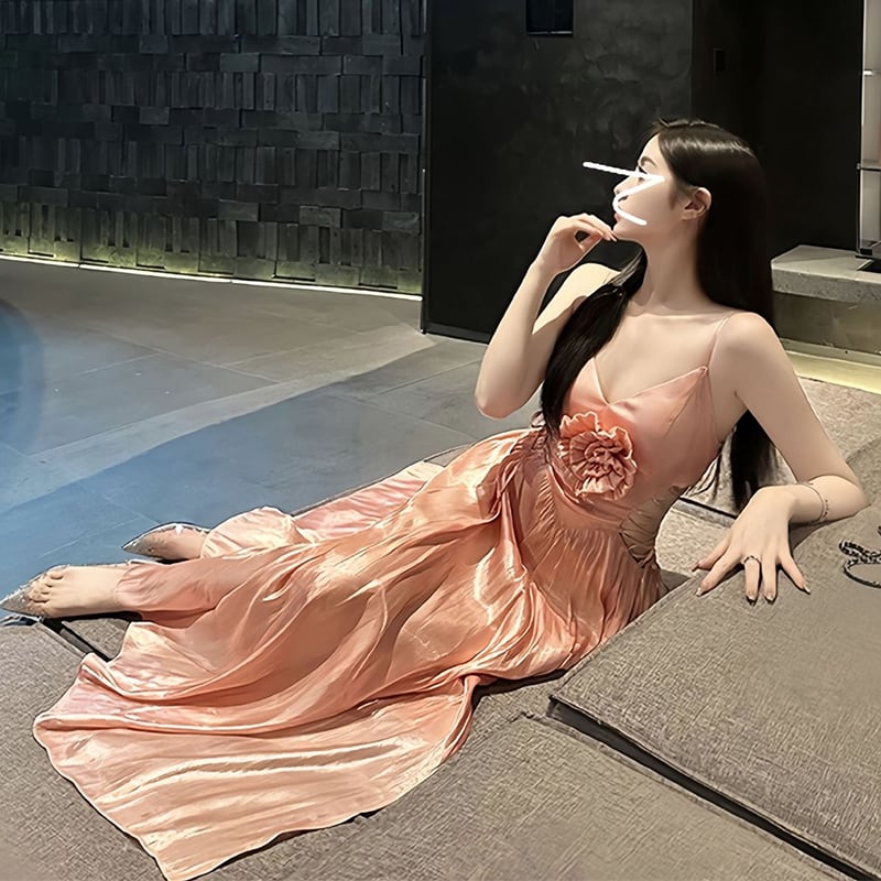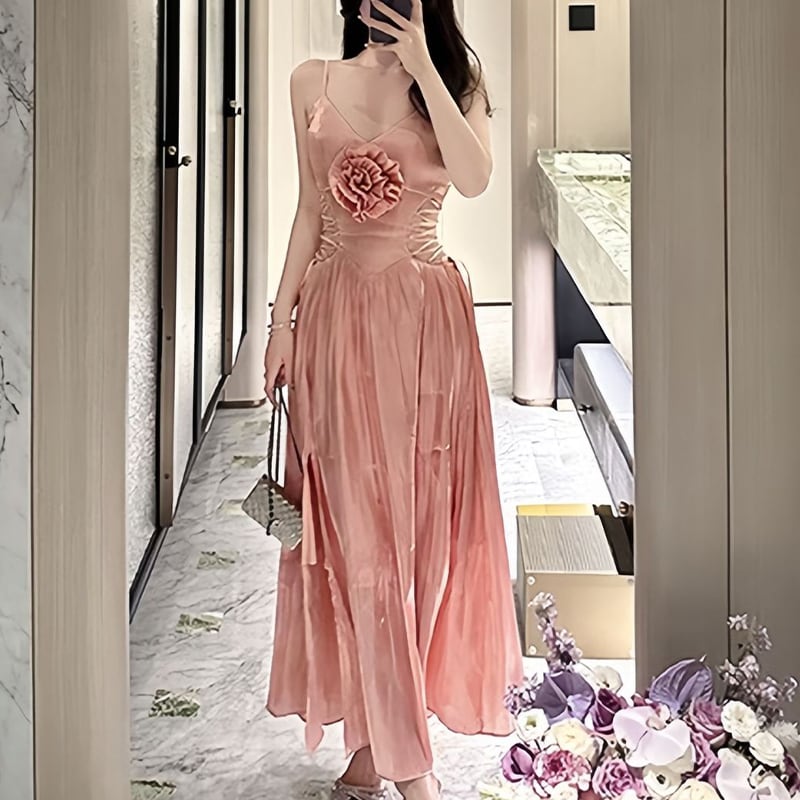 【Airi Styleシリーズ】吊りワンピース 気質UP セクシー 立体フラワー パーティー ロング丈 ピンク S M L