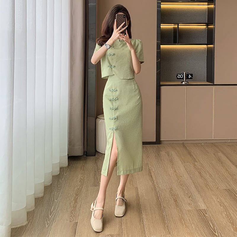 【森森家シリーズ】セットアップ トップス+スカート チャイナ風 スリット フェミニン ライトグリーン S M L XL