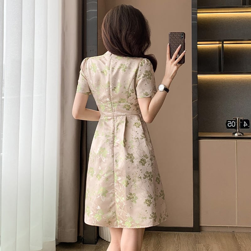 【森森家シリーズ】ワンピース チャイナ風 Aライン プリント 花柄 大きいサイズ シャンパン色 S M L XL 2XL