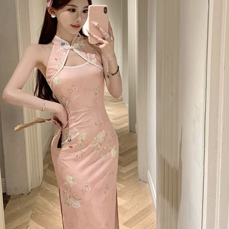 ワンピース チャイナ風 ノースリーブ プリント 好感度UP ピンク S M L