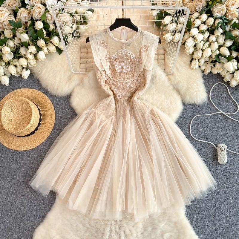 【RIMIシリーズ】ワンピース ノースリーブ Aライン 刺繡 ダークベージュ S M L XL