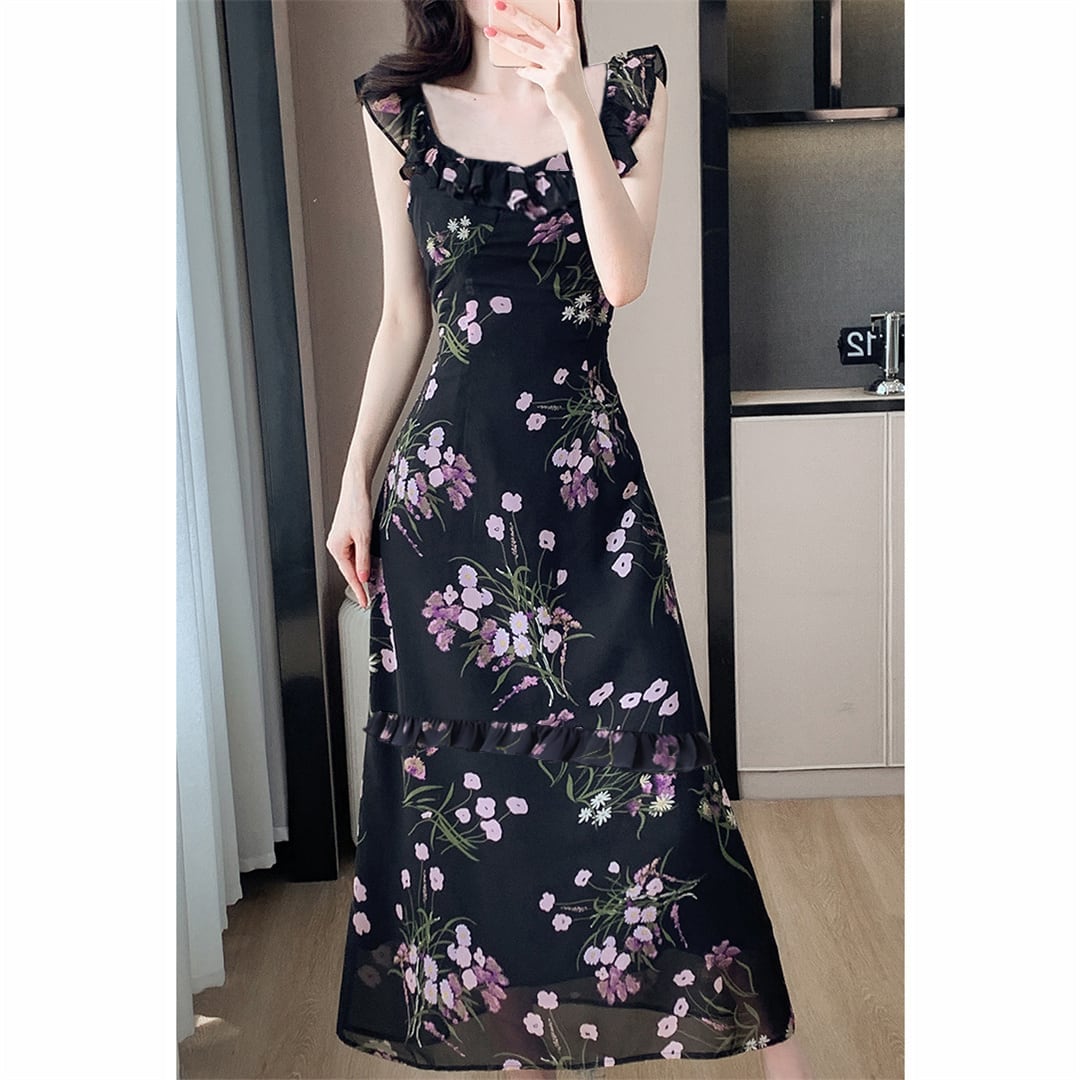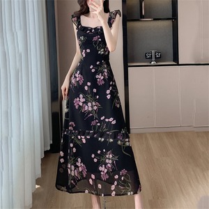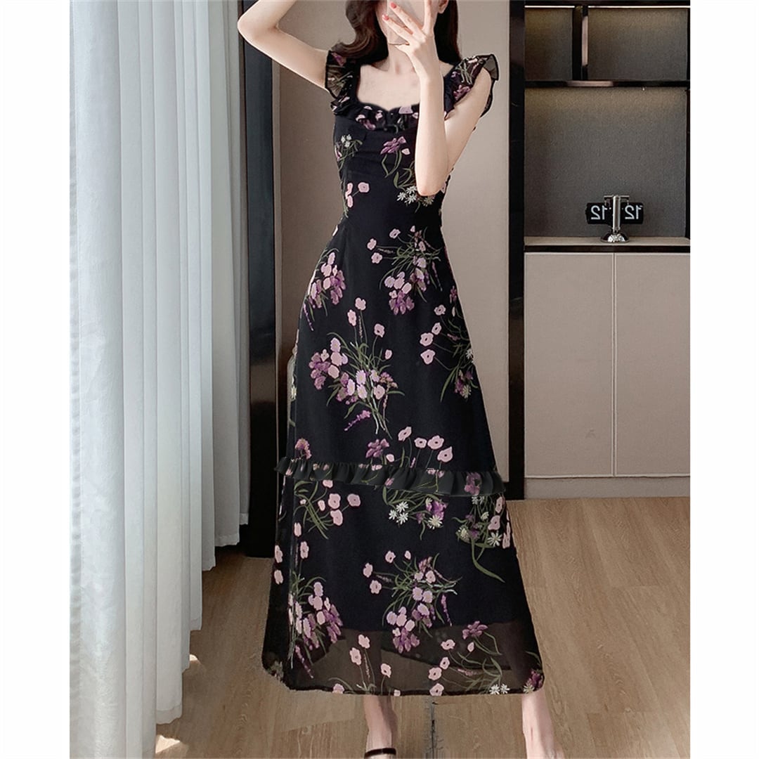 【森森家シリーズ】ワンピース 細見せ 花柄 ブラック ロング丈 S M L XL 2XL