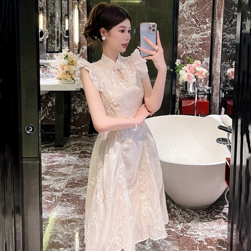【RIMIシリーズ】ワンピース チャイナ風 刺繡 大きいサイズ アプリコット S M L XL 2XL