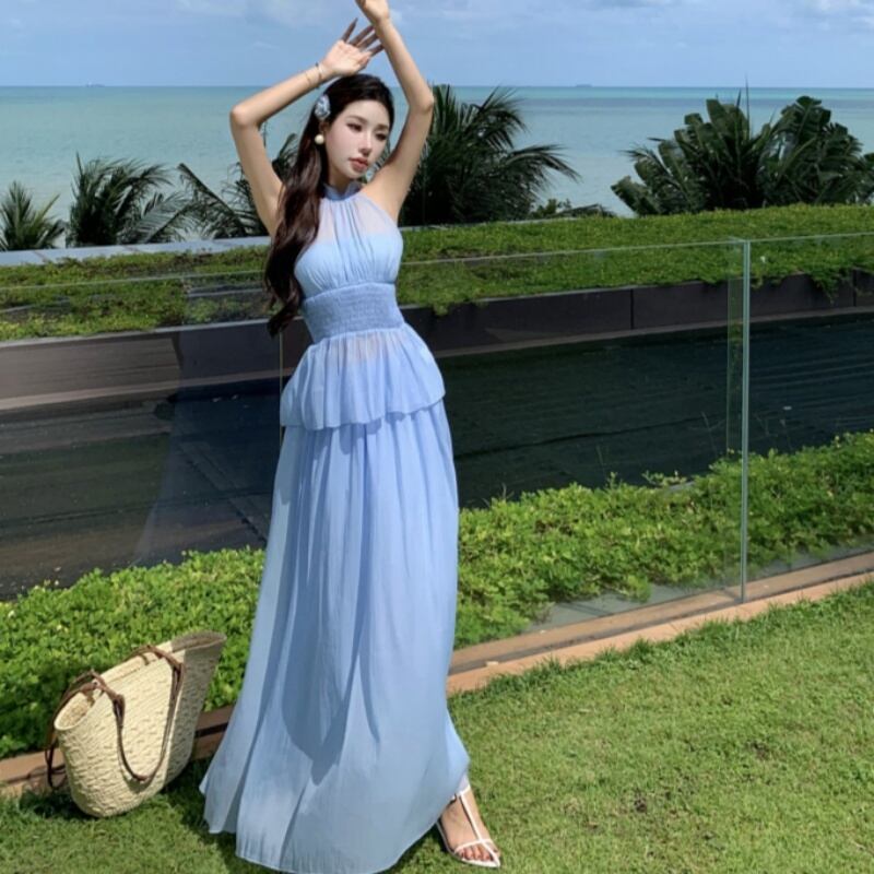 【SummerVacationシリーズ】セットアップ トップス+スカート 無地 清新 ブルー S M L