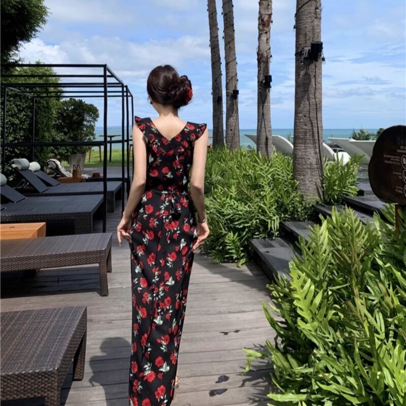 【SummerVacationシリーズ】ワンピース 花柄 着痩せ 女っぽさが漂う ブラック S M L